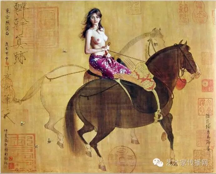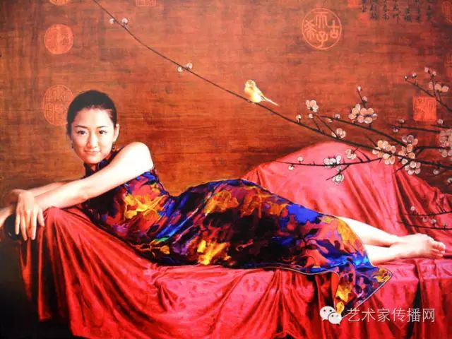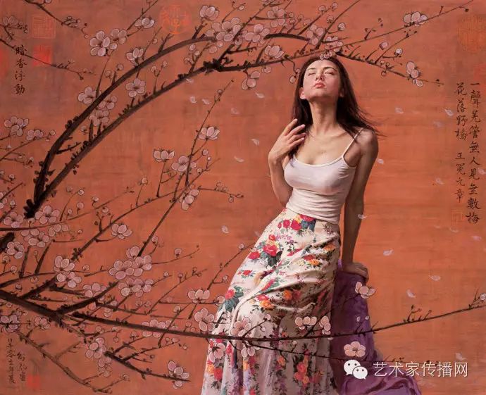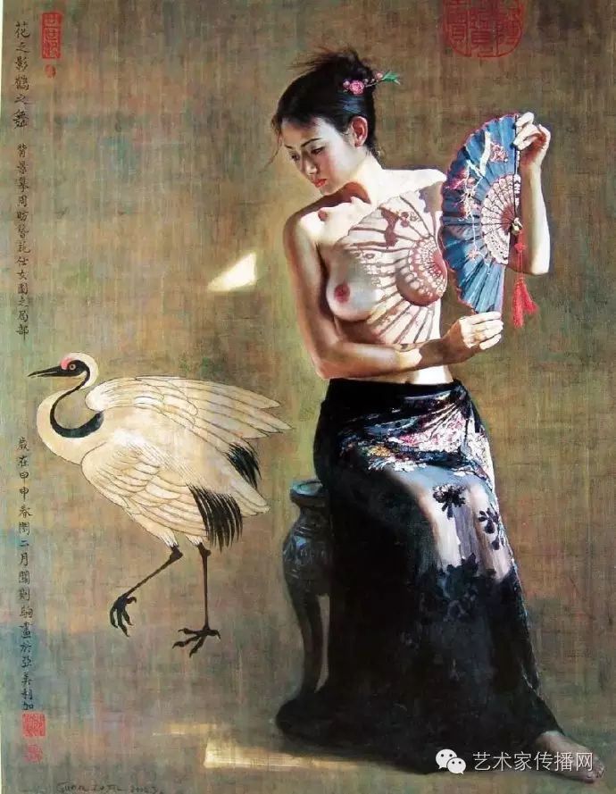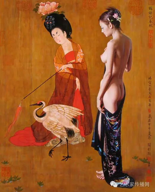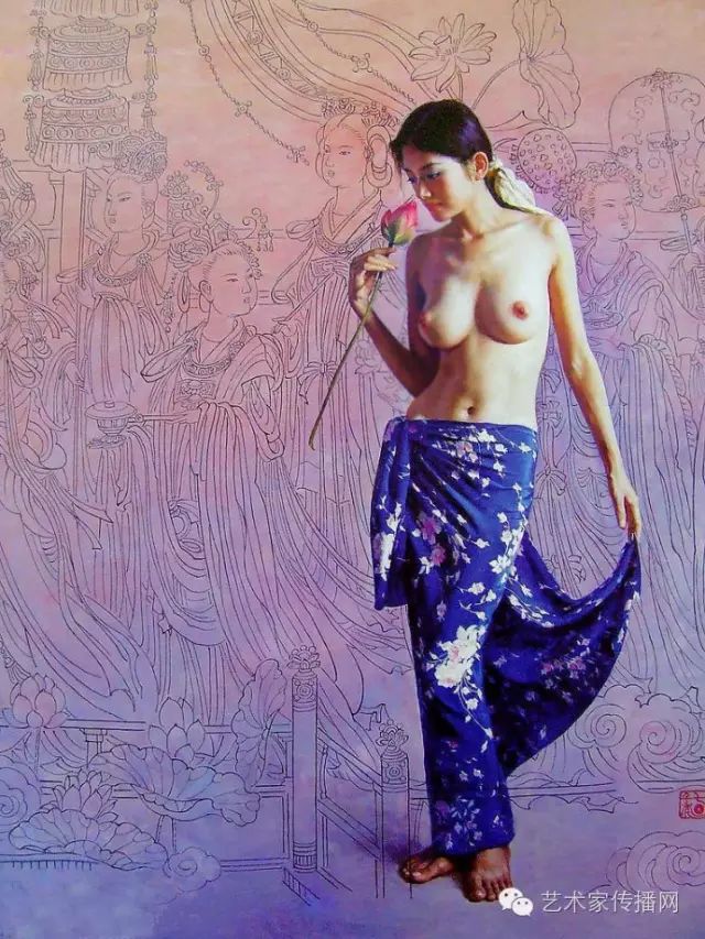 打上灯光,有很神奇的效果。古画有的画在纸上,有的画在绢上,时间长了,有些变色或剥落,反而有种厚重的历史感,我放在后面刚好衬托前面的人体。十多年来我的画风虽然有所改变,但我有我的风格,一画出来就像我自己。