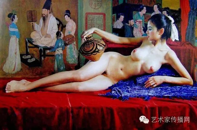 一个新鲜的,一个陈旧的。一个平面的,一个立体的,我要两方面照顾,国画是平面的,边线比较清楚,要表现出线条的感觉,好跟前面的裸体相呼应。