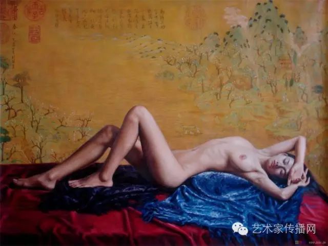 我用的材料也不同,前面的人体用油画颜料,后面的古画用丙稀,是用水来调的。一个用油画笔,后面用中国毛笔来画。