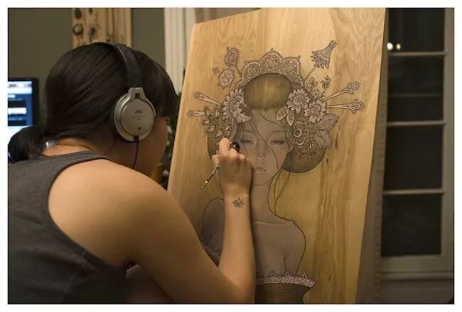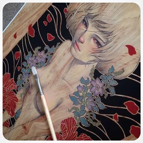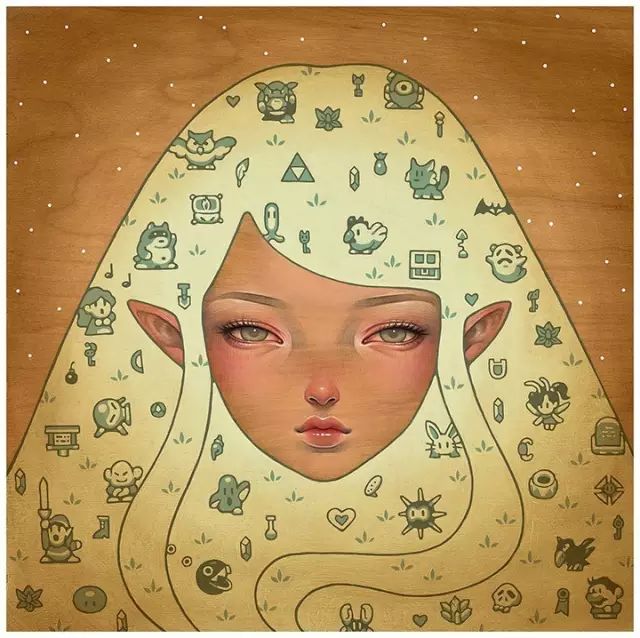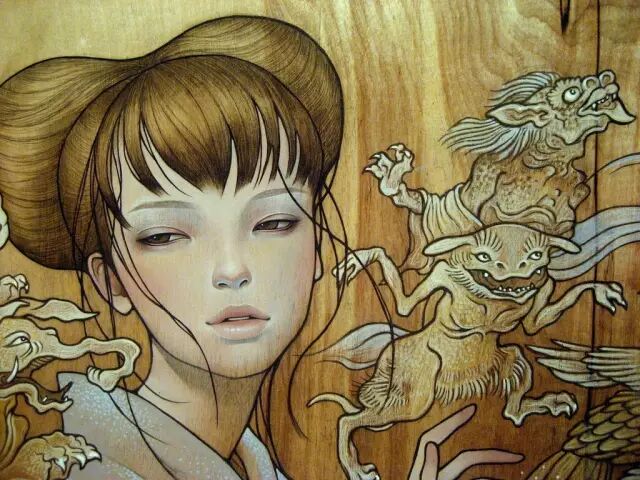 Kawasaki的作品是直接将油画颜料画在木板上,她将她的个人艺术风格与日本的漫画融为一体,创造出一种新颖的绘画风格,古朴又非常地耐看。