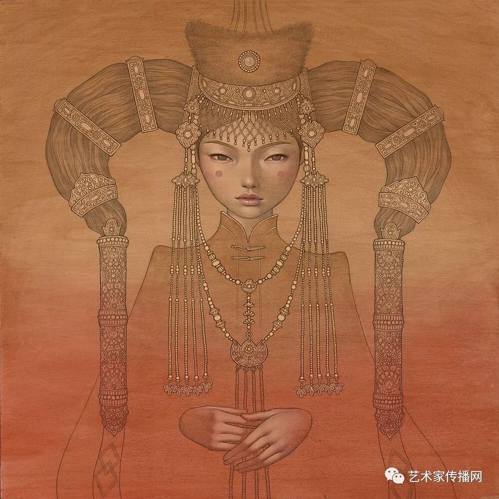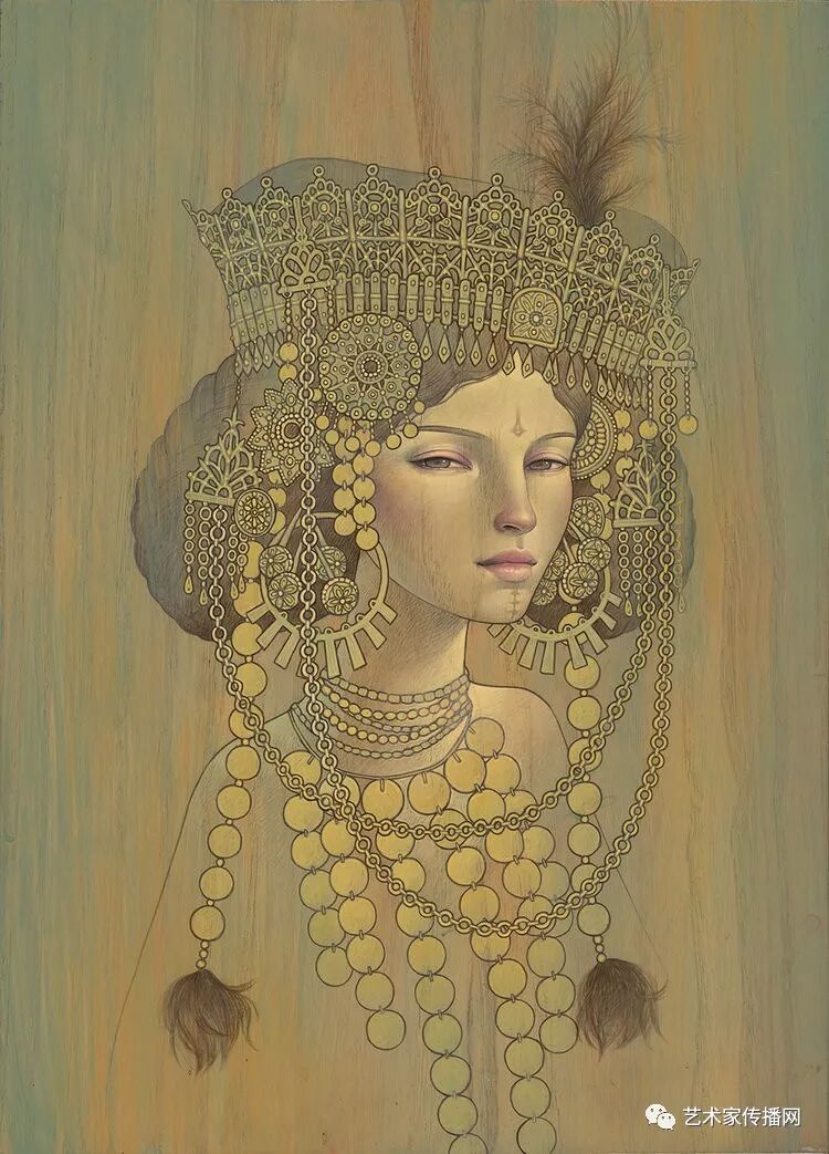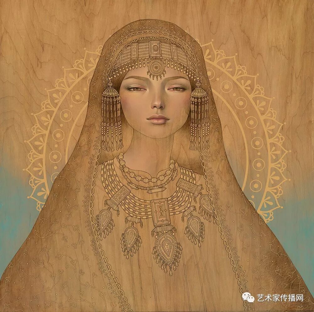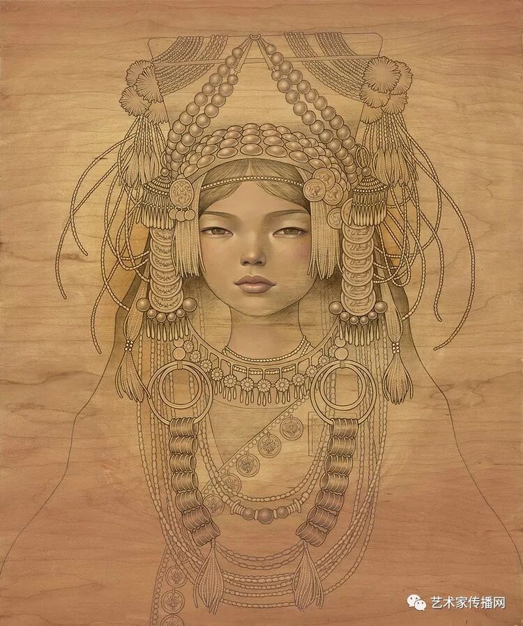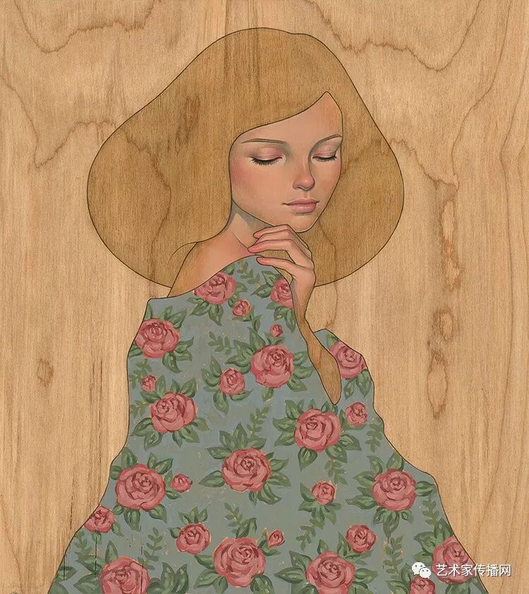 在她的画上,我们能看到她的清晰的木纹,以及令人过目难忘,无辜、眼神充满了忧伤感的美丽少女。