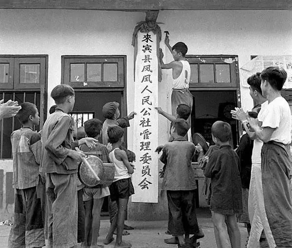 1958年8月22日,广西壮族自治区来宾县凤凰乡10个农业社成立凤凰人民公社,这是社员们正在挂牌。