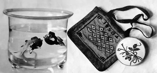 1958年,一家手工编制长编制的书包、刺绣和蛋壳做的金鱼。