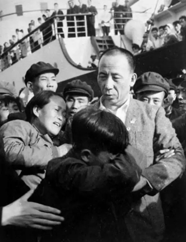1958年,刘连仁回国,下船后和家人团聚,前左是他的妻子,中是他的儿子。