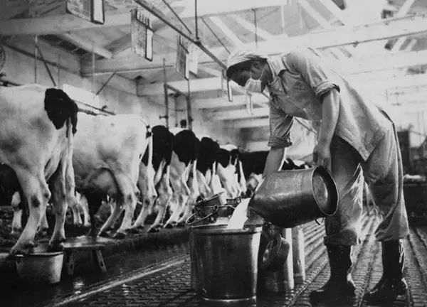 1958年,上海牛奶公司第四牧场工人在做挤奶工作。