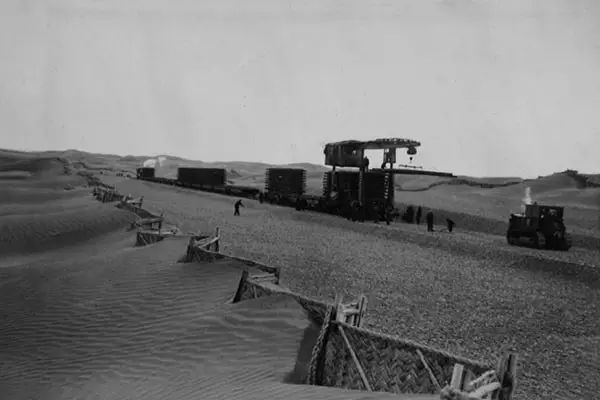 1958年,包兰铁路建设进入腾格里沙漠地带,黄沙被阻止在路基两旁,工人们正在紧张铺轨。