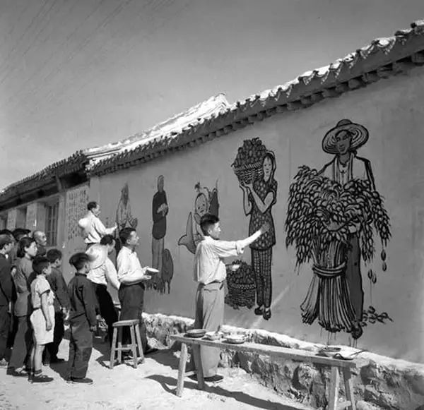 1958年,河北省怀来县花园乡的南水泉村,画家们在为农民作壁画。时盘棋/摄。