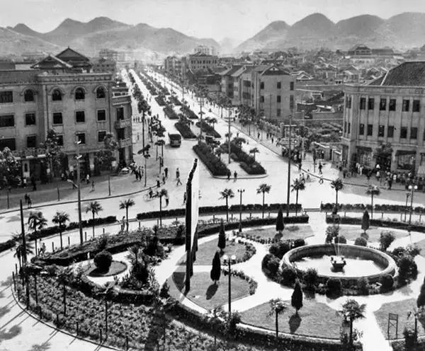 1958年,贵阳市中心区喷水池,这里在解放前街道狭窄、房屋破烂,现在马路宽阔,还修了近代化的广场。