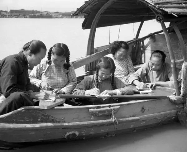 1958年9月,福建省福州市船民妇女在练习写字。解放前,福州市的水上居民中妇女100%都是文盲。