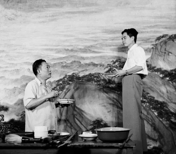 1959年9月初,北京,画家左起傅抱石、关山月联手为人民大会堂绘制巨幅水墨画《江山如此多娇》。
