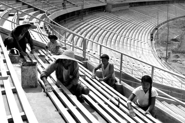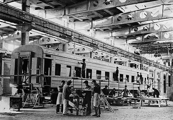 1959年,长春,总装车间职工正在加紧装配第一辆看窗式新型硬席寝车。