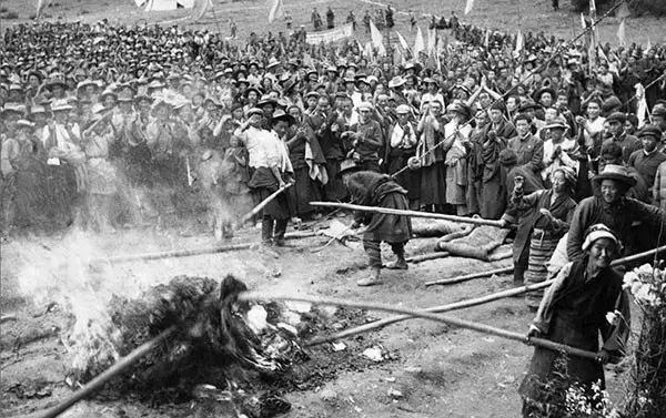 1959年8月,西藏自治区的藏民在焚烧他们的卖身契和高利贷债券。