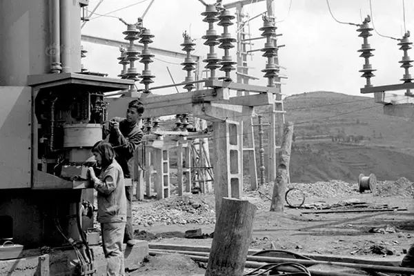 1959年国庆前夕,云南省重点工程之一阳宗海电厂,工人们正在安装电缆。