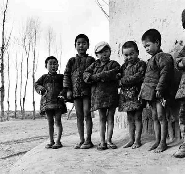 1958年,甘肃省武威县,农场里几个穿破棉袄的光腿孩子。 黎枫/摄。