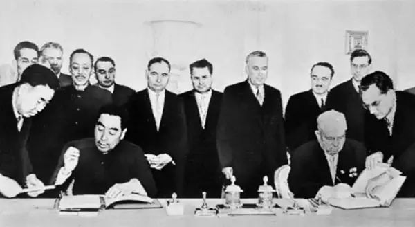 1959年2月7日,莫斯科,周恩来与赫鲁晓夫签订1959-1967年间帮助中国建设78个大型工业企业和电站的协定。