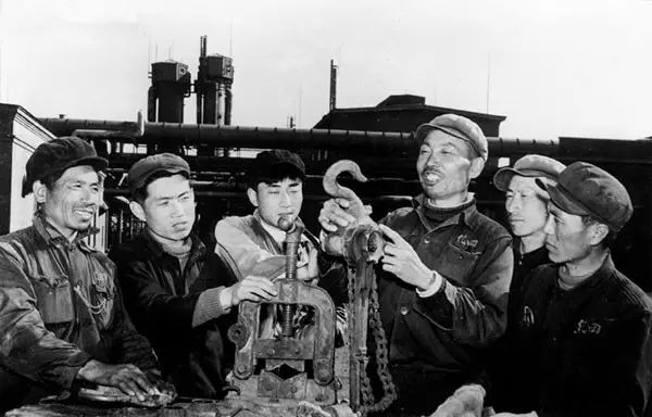 1958年,吉化建设公司的老工人范信芝将自己的手摇式起重机献给国家,并把使用方法介绍给大家。