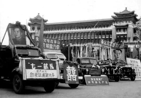 1958年,重庆生产的汽车在人民大礼堂报喜。