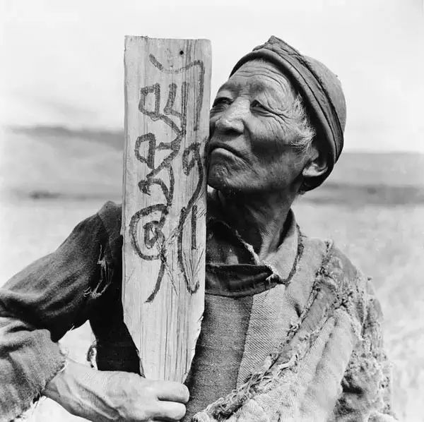 1959年,西藏自治区曲松县拉加里,农奴桑登将象征着自己土地的木牌紧紧抱在怀中,上面藏文意思是:"桑登的田"。
