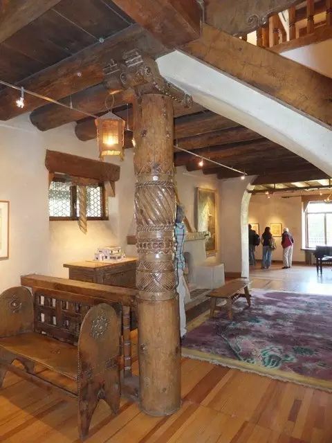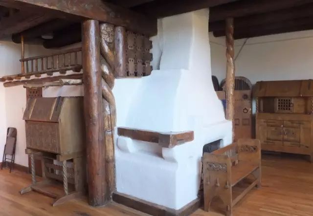 他在造房子的时候雇用了当地的劳动力,门和窗子是俄国式的,费欣在自己的房子里使用斧子雕琢出门框、柱子、窗框、栏杆、椅子、床,甚至檐外木雕的装饰。他先在木头上凿出肌理,再用手工雕刻造型,制作出一件件令人赞叹的作品。每一个纹理的雕刻,都能看得出他深沉的乡思。费欣的木质家具和拼花壁橱都用蜜蜡打磨上光,保存原木本色和纹理。大气的布局,朴素的色调,稚拙中透出无比的精致,一切都美轮美奂。