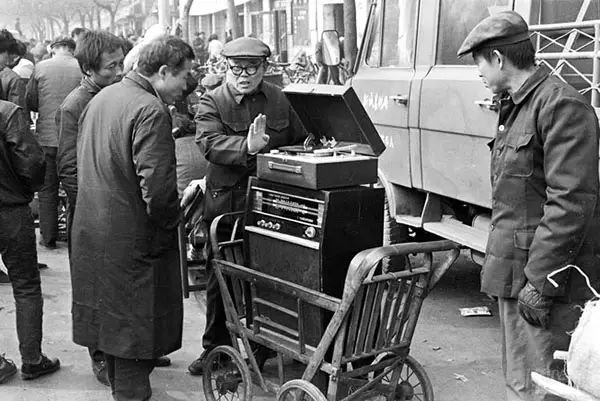 1989年,西安北门外,一位老人在街上展示他从旧货市场上买来的留声机。赵利文/摄。