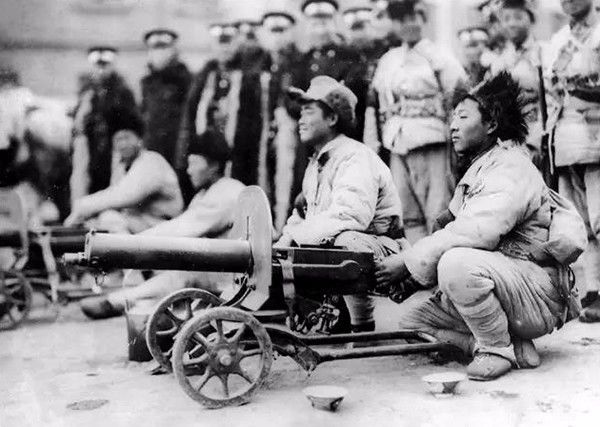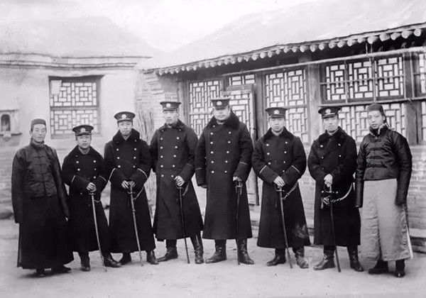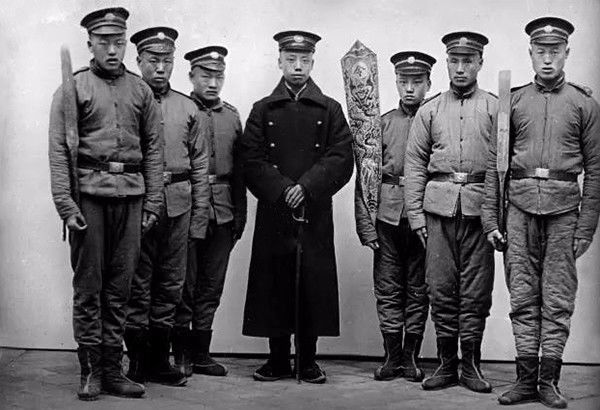 1911年,北京,脚穿中式布靴、手执龙旗的新军军官与士兵。
