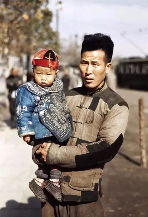 1945年,上海,8年抗战结束后流落街头的难民父子。
