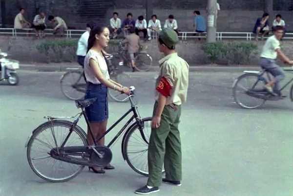 1988年,西安,戴红袖箍的与推着自行车的女青年。赵利文/摄。