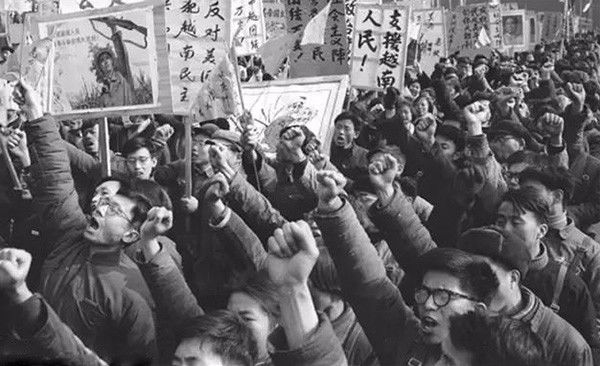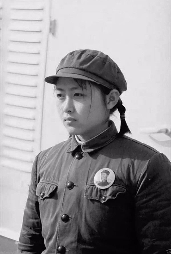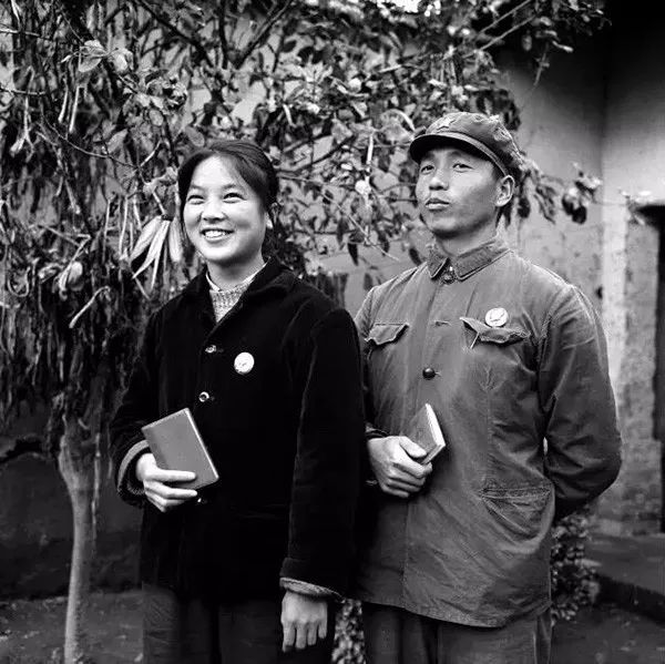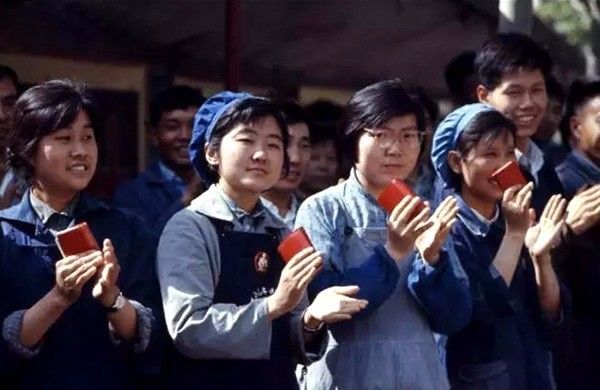 1971年, “文革”年代的青年时尚,工装工裤,胸带毛主席像章,人手一本毛主席语录。