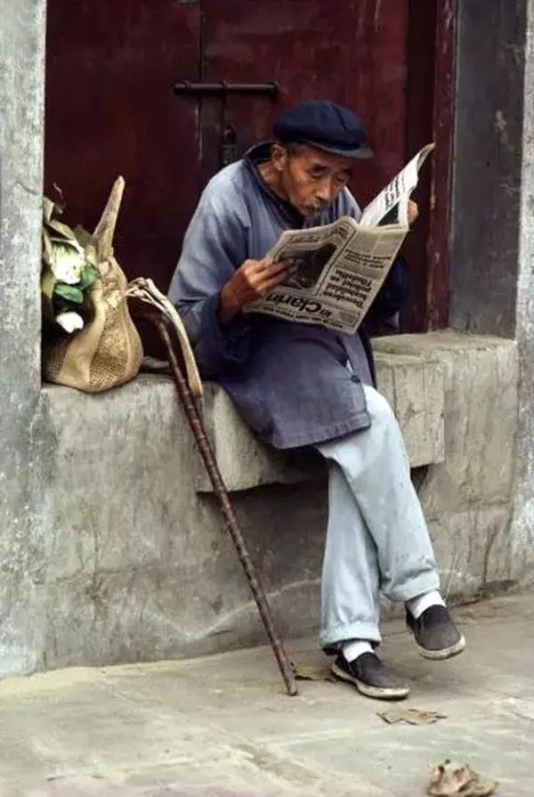1980年,上海,这位老人实际上正仔细阅读着一份双文报纸的英文部分。
