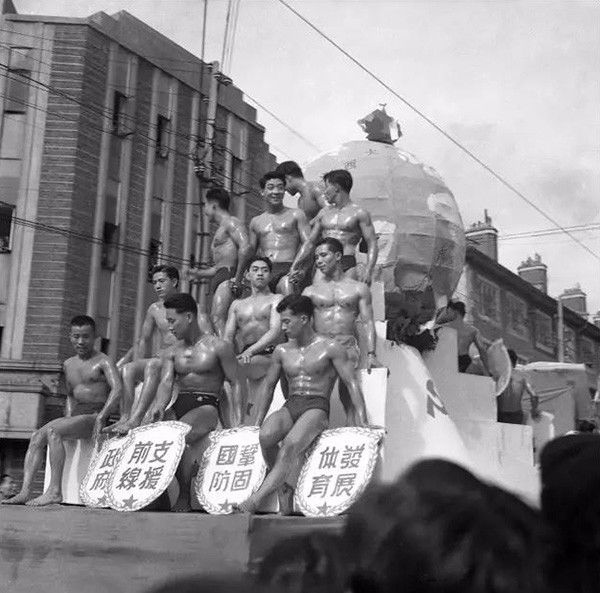 1950年,上海,身材健硕的运动员们庆祝解放一周年游行。周海婴/摄。