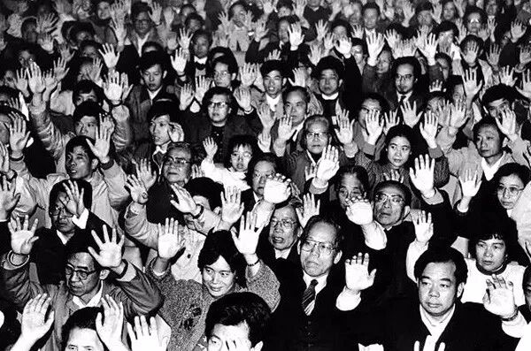 1986 年,接受“气功大师”指导,正在“发功”的人们。