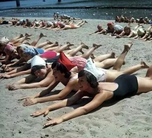 苏联高中生在沙滩上晒日光浴。