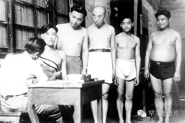 1943年,国民政府修改《兵役法》,明确实行征兵制,并鼓励青年学生参军。图为1943年,重庆入伍青年在进行身体检查。