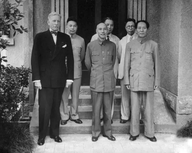 1945年9月,重庆谈判期间,毛泽东与蒋介石及美国大使帕特里克·赫尔利合影。杰克·威尔克斯/摄。