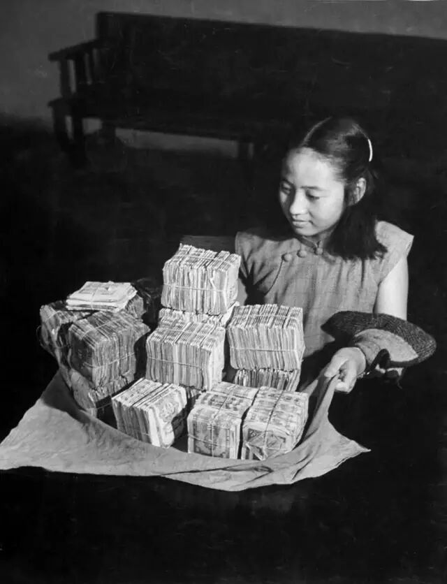 1945年8月,重庆,通货膨胀使得纸币严重贬值,一个女孩抱着一大堆不值钱的纸币。杰克·威尔克斯/摄。