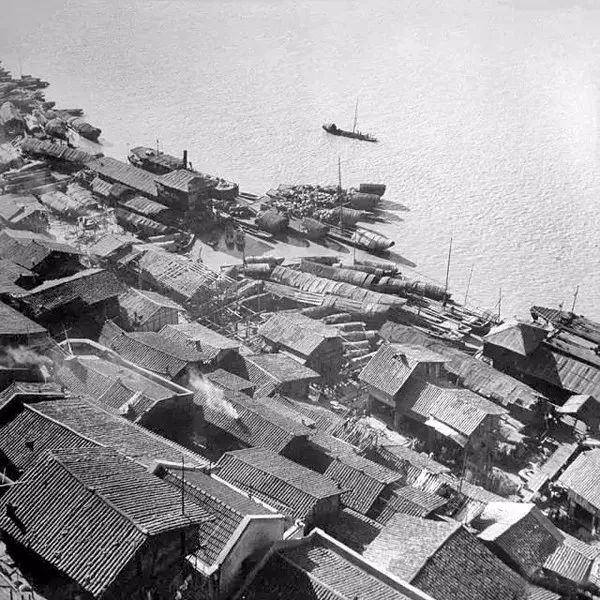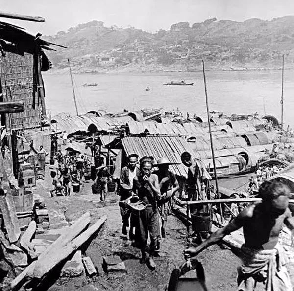 1910年,重庆朝天门,木船在江边停靠,人们赤着上身在码头上辛勤劳作,挑起扁担运送货物。