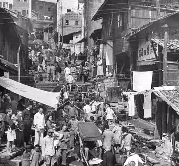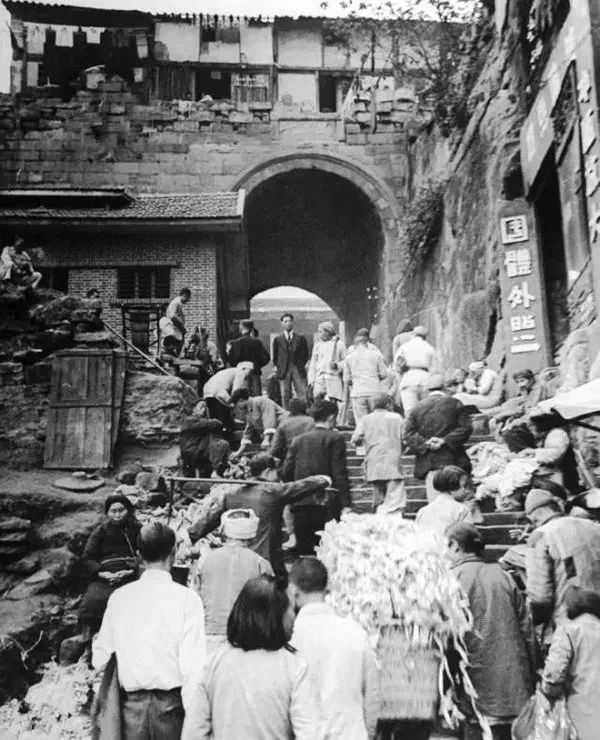 1943年,重庆朝天门,人潮涌动的挑夫、行人们正在石台阶上行走。