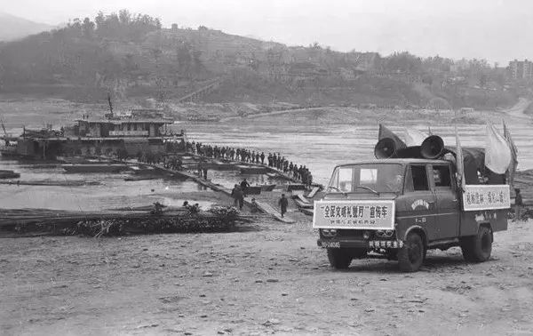 1970年代,重庆九龙坡九渡口江边,到对面李家沱的人车往来都靠渡船。