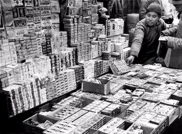 1945年8月,重庆,摆地摊卖美国香烟的小贩。杰克·威尔克斯/摄。