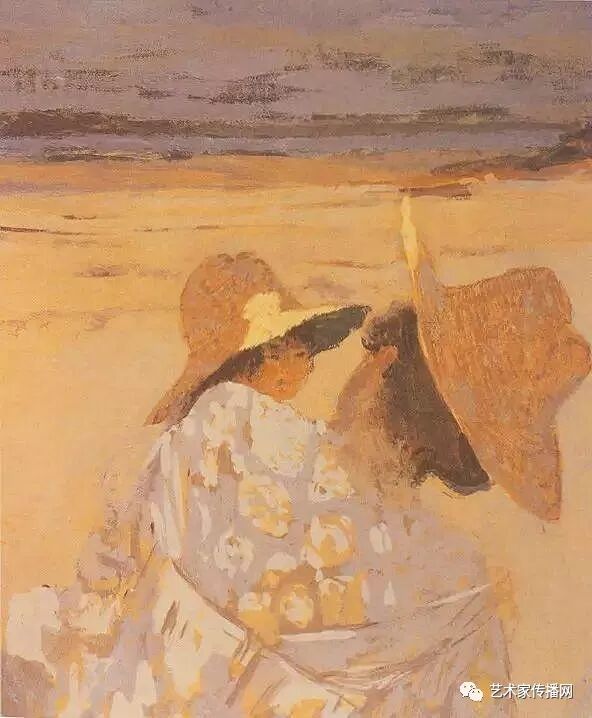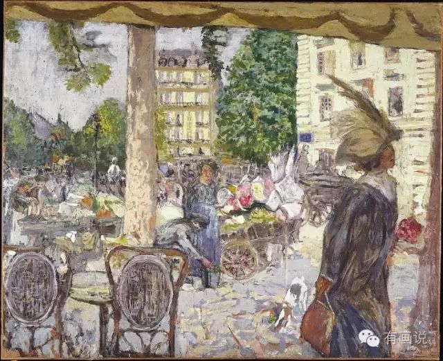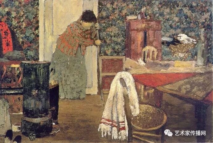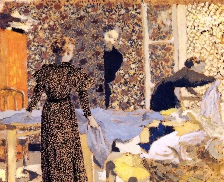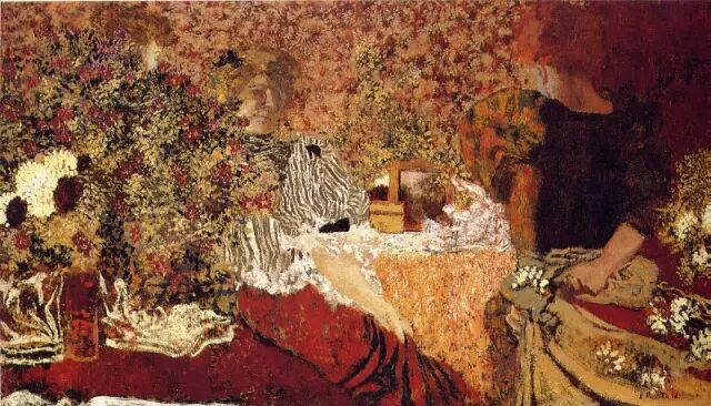 使用印象派的绘画笔触用大块的颜色,并把物体的外形轮廓虚化,形成一种隐约、含蓄、朦胧的画面感 ,使观看者对维亚尔的作品产生一种象征意义和充足的想象空间。