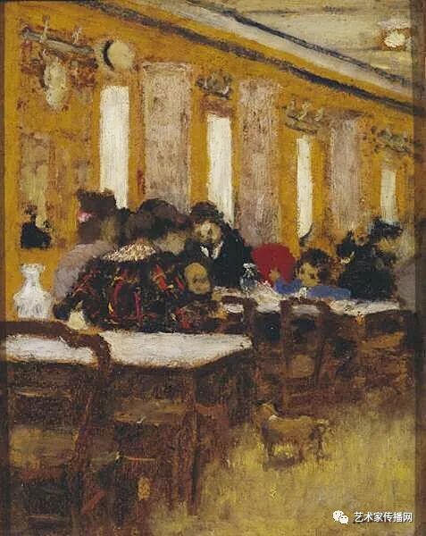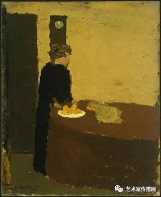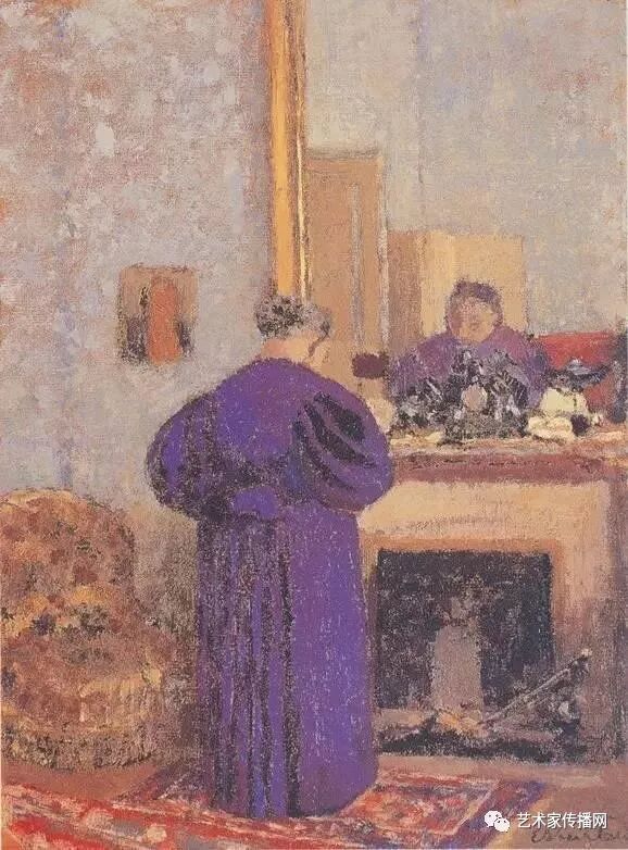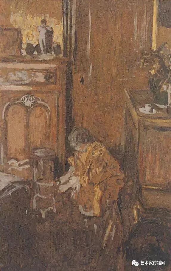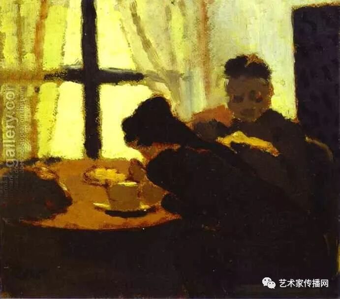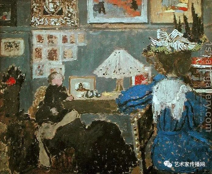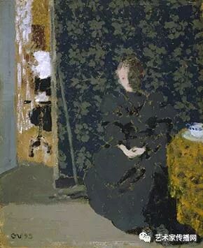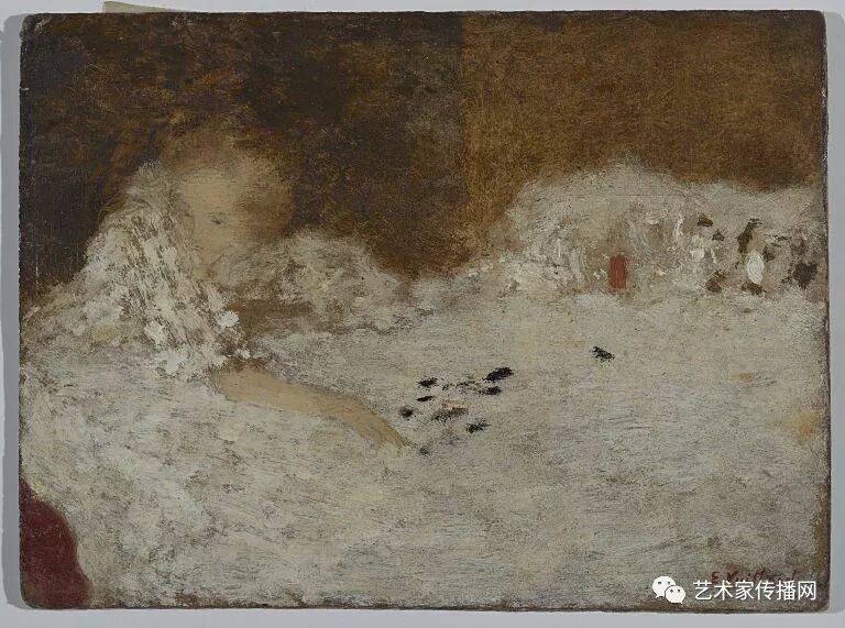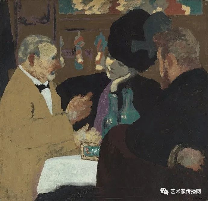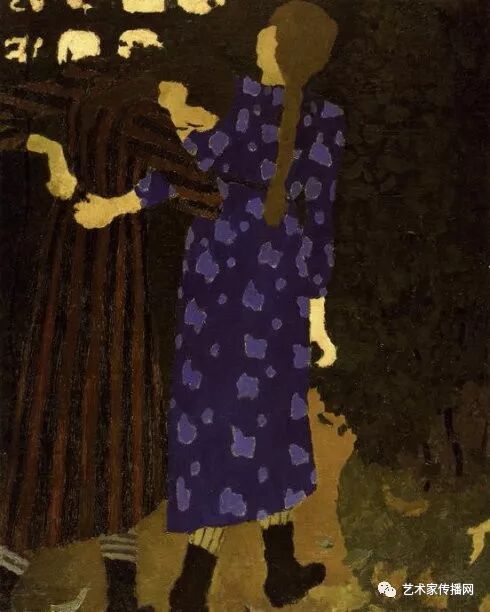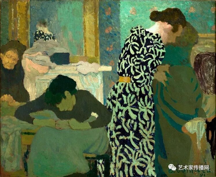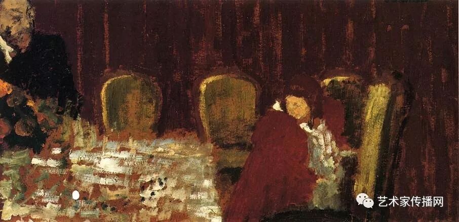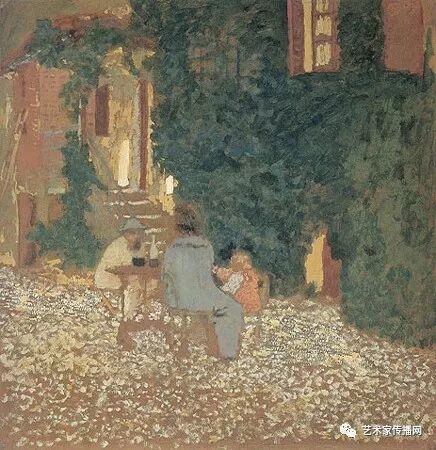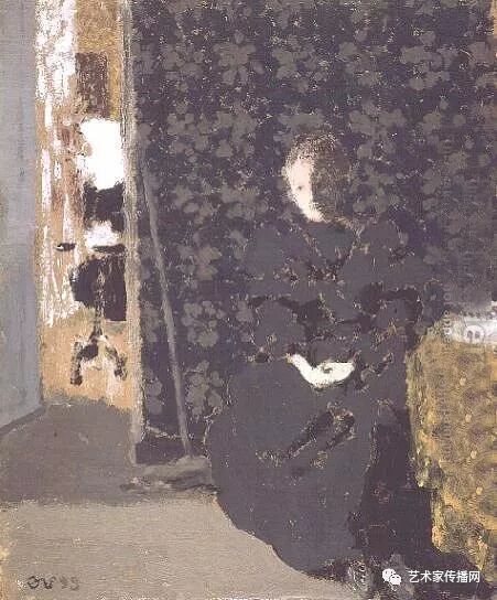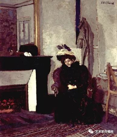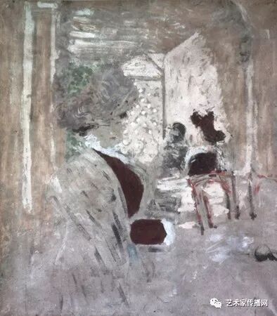 分析维亚尔早期的创作中不使用油画布,而是采用具有强烈吸附力的卡纸。这种画面形成一种粗糙的效果,和谐暗柔的 “高级灰”色调 ,画面不张扬却显得高贵华丽。