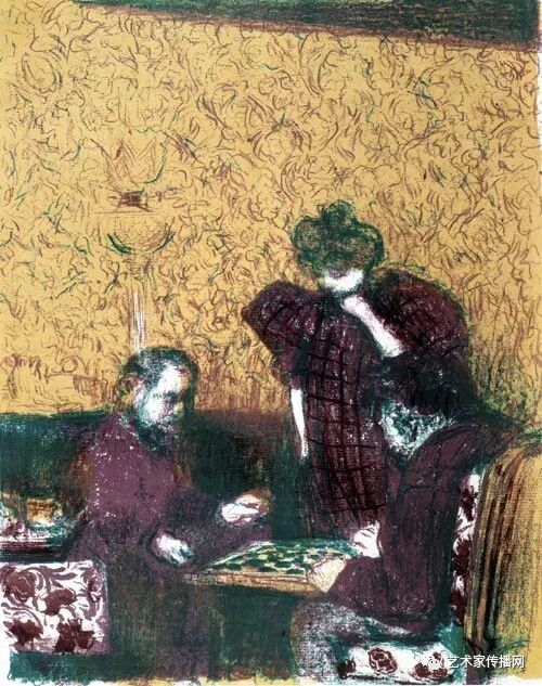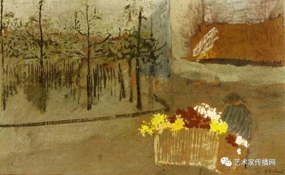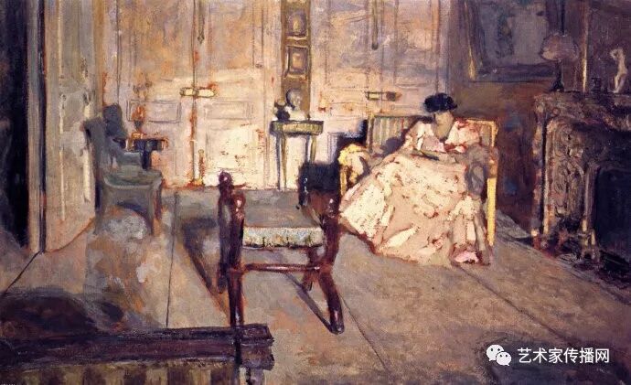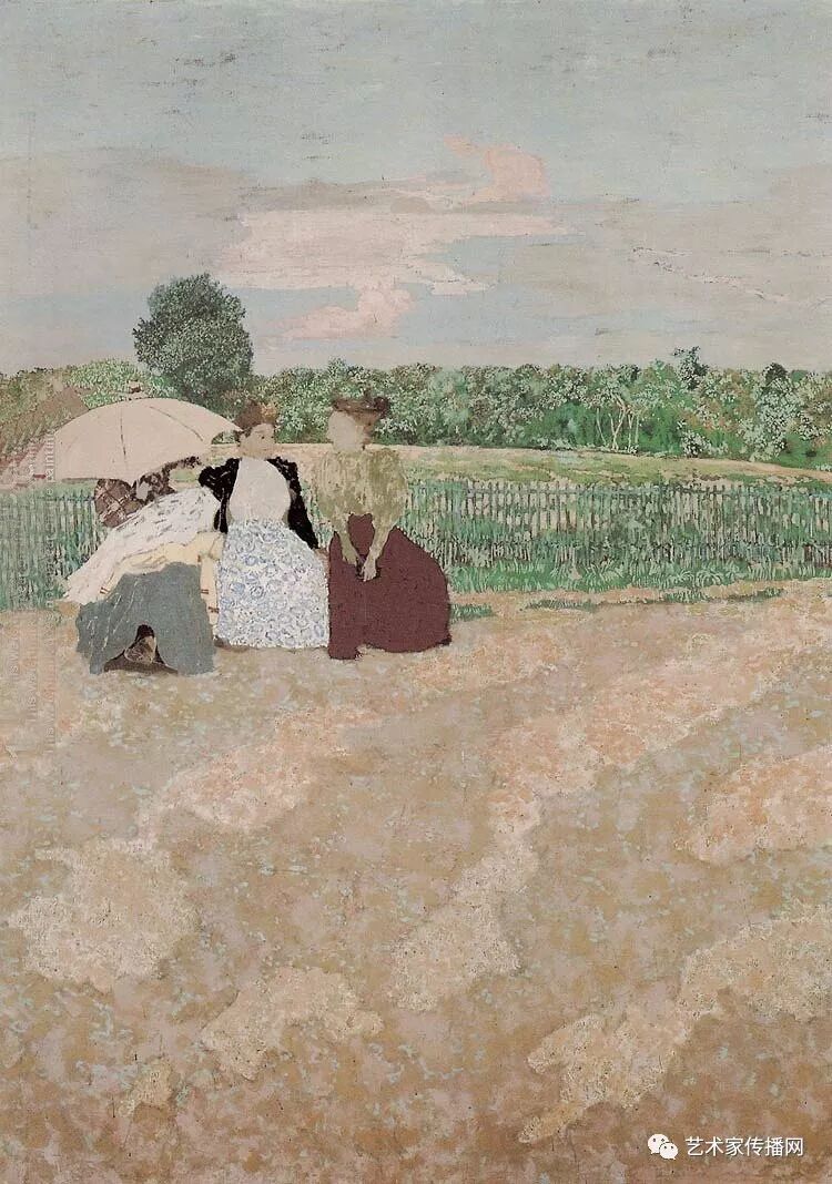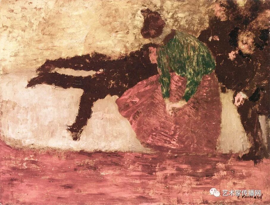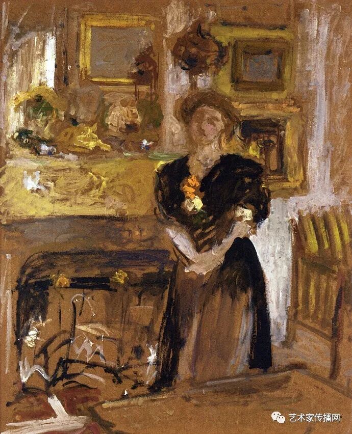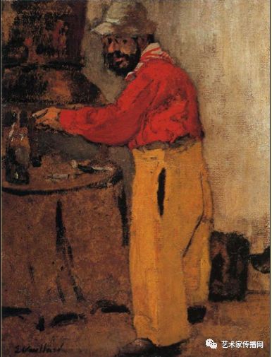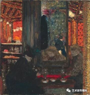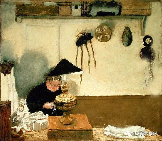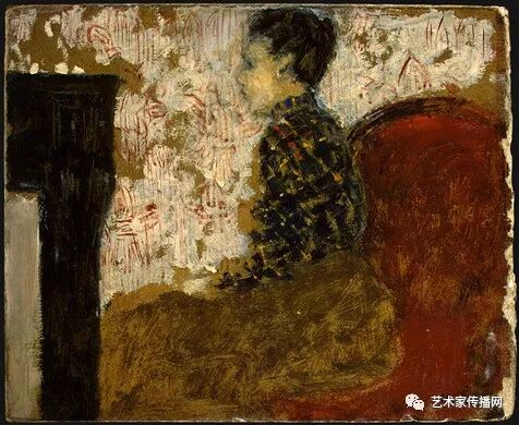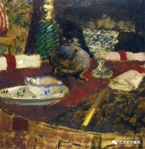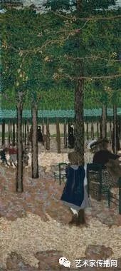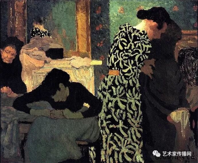 分析维亚尔早期的创作中不使用油画布,而是采用具有强烈吸附力的卡纸。这种画面形成一种粗糙的效果,和谐暗柔的 “高级灰”色调 ,画面不张扬却显得高贵华丽。
