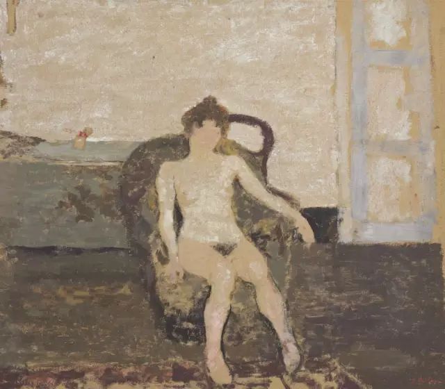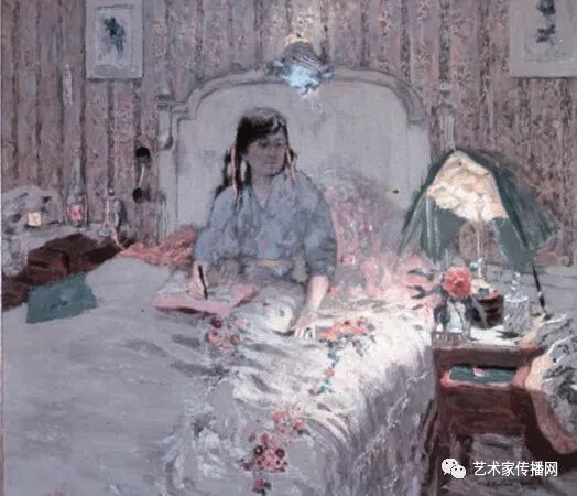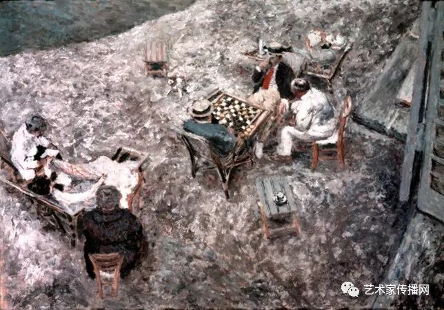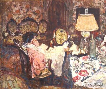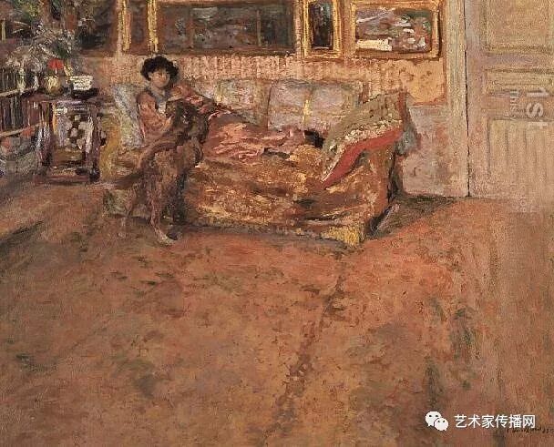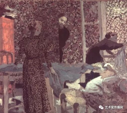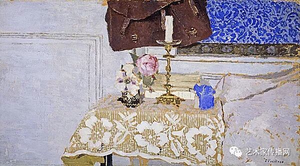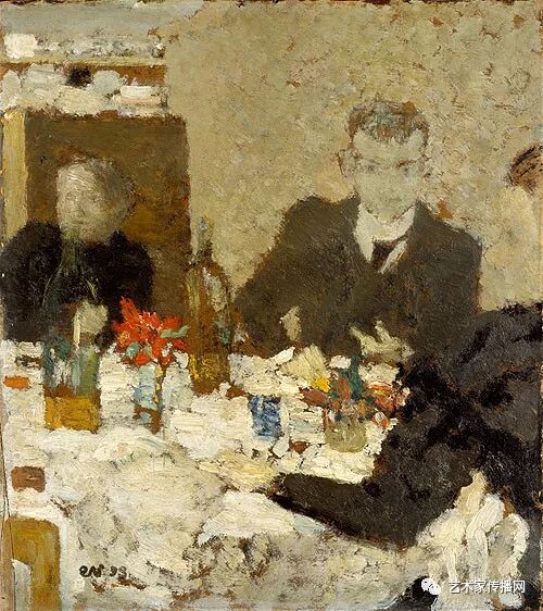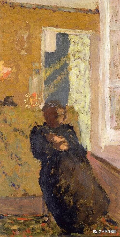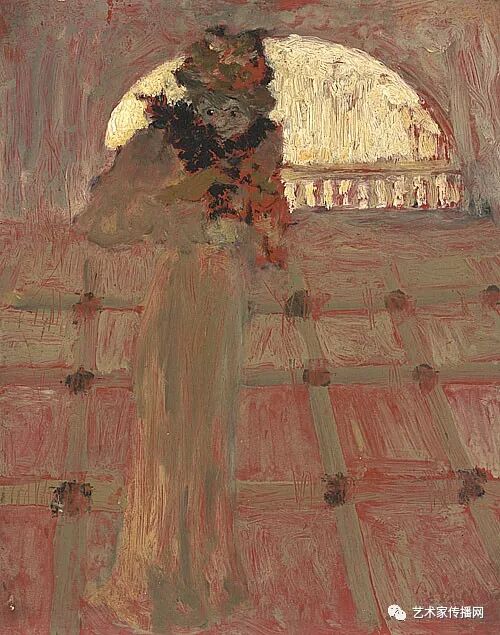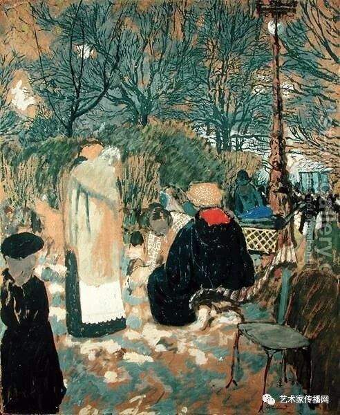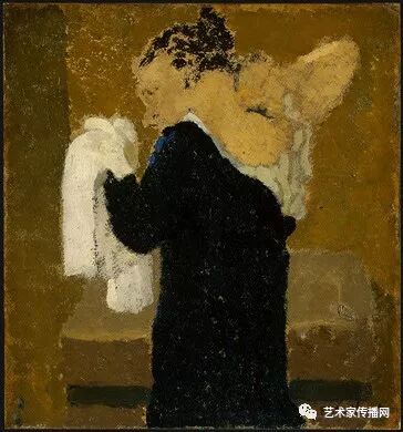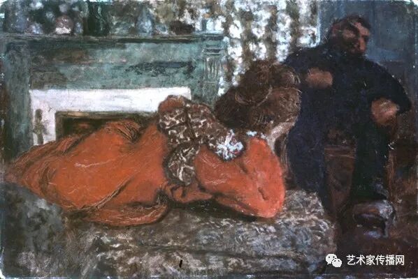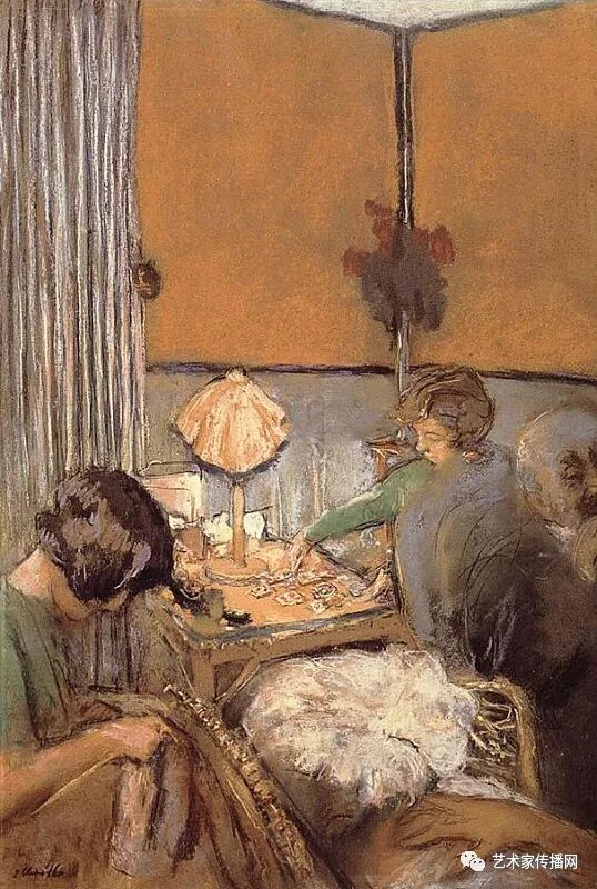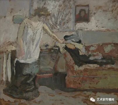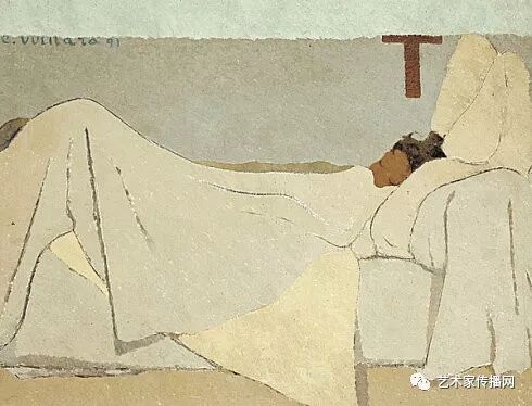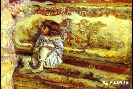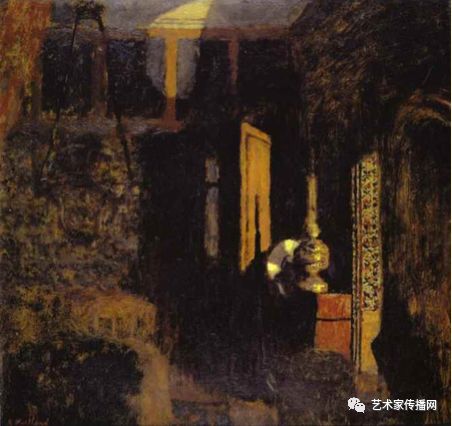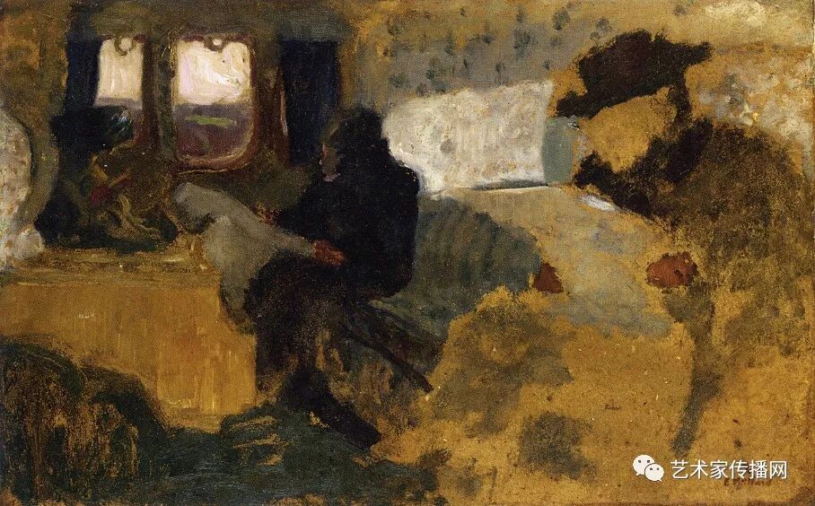 分析维亚尔早期的创作中不使用油画布,而是采用具有强烈吸附力的卡纸。这种画面形成一种粗糙的效果,和谐暗柔的 “高级灰”色调 ,画面不张扬却显得高贵华丽。