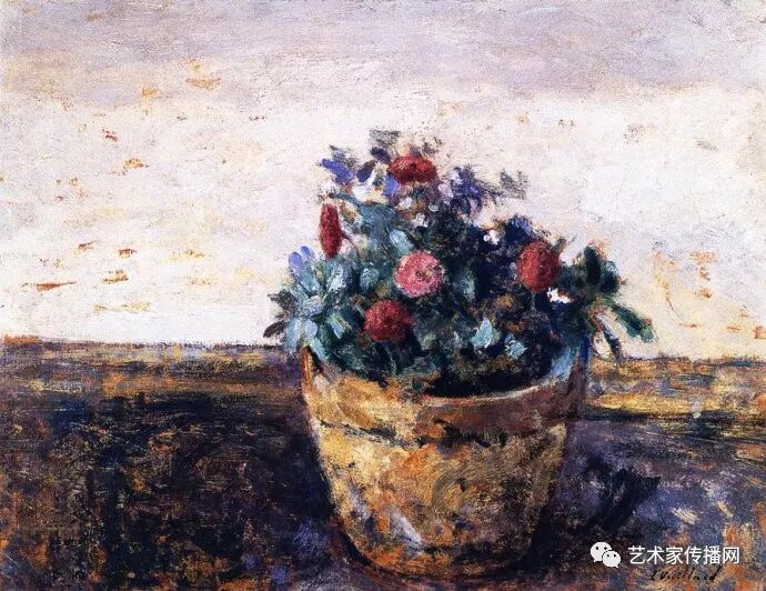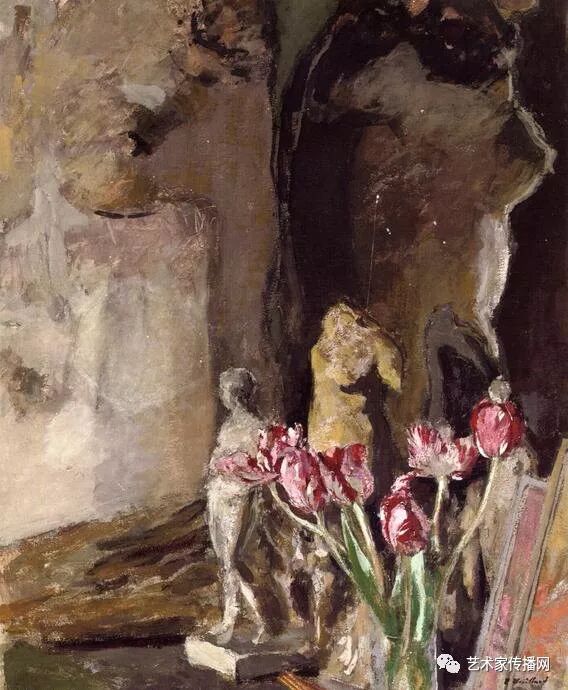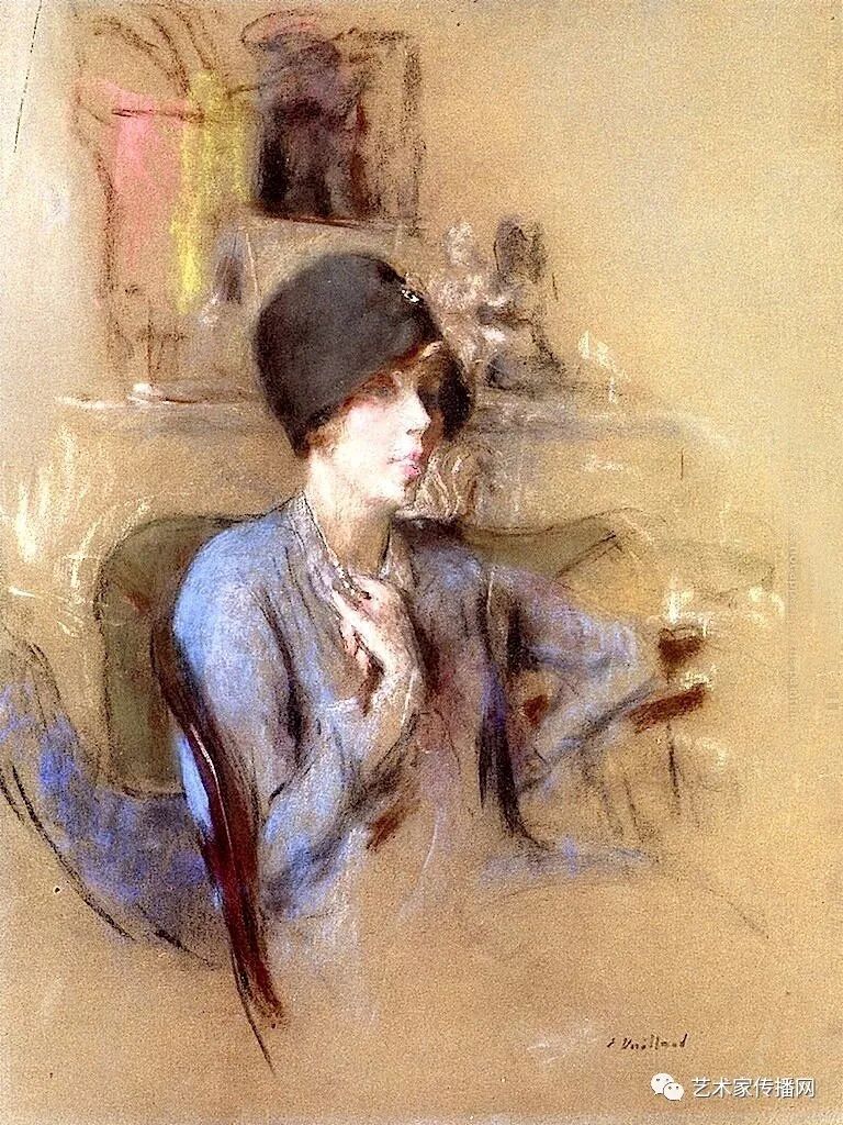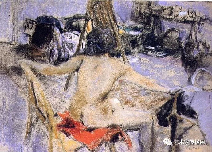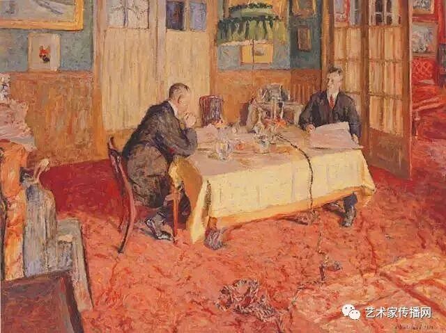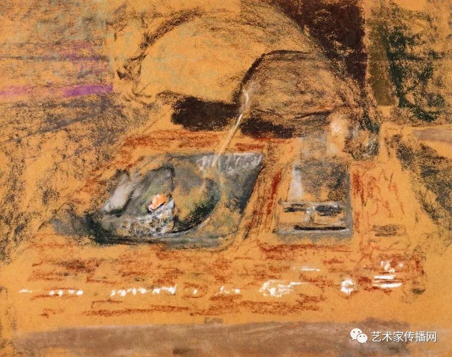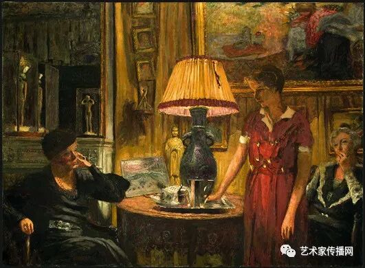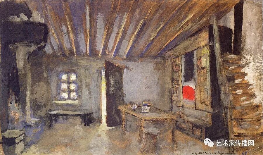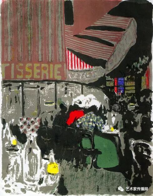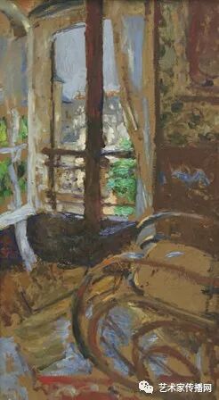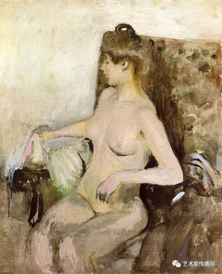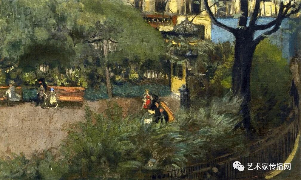 分析维亚尔早期的创作中不使用油画布,而是采用具有强烈吸附力的卡纸。这种画面形成一种粗糙的效果,和谐暗柔的 “高级灰”色调 ,画面不张扬却显得高贵华丽。