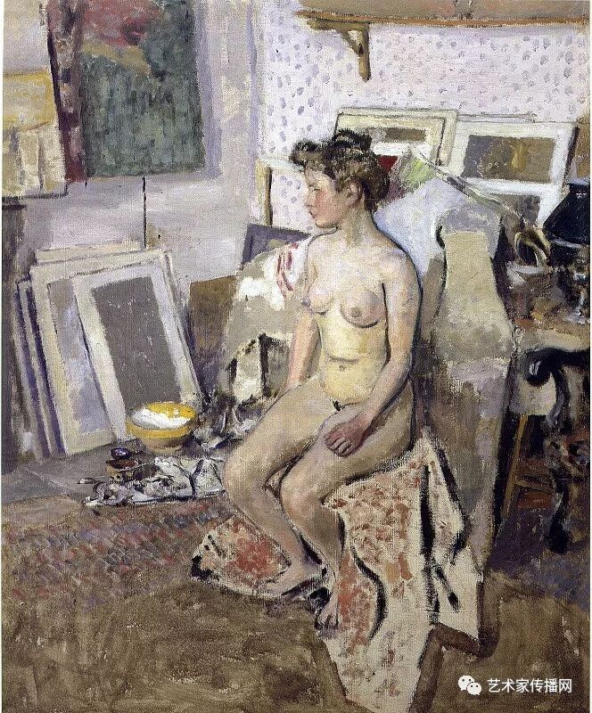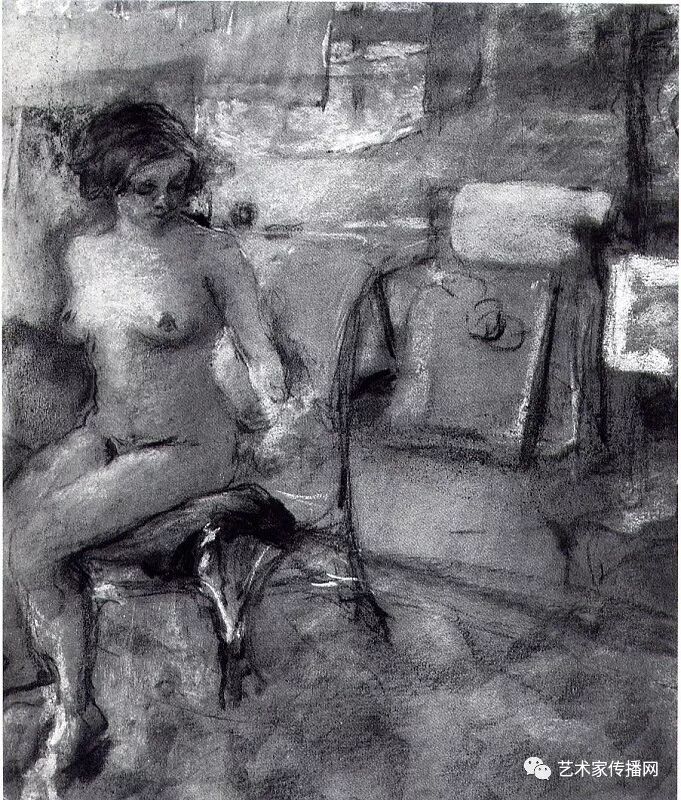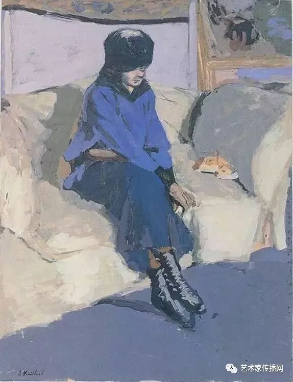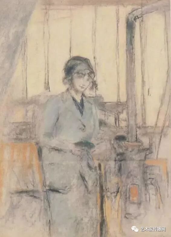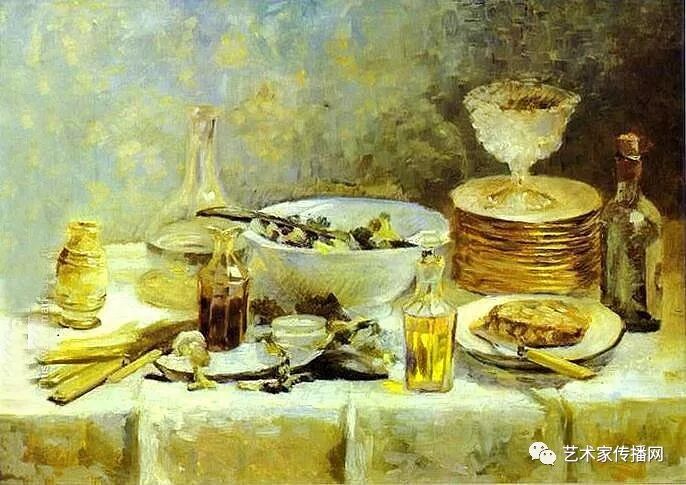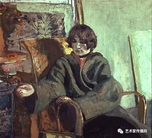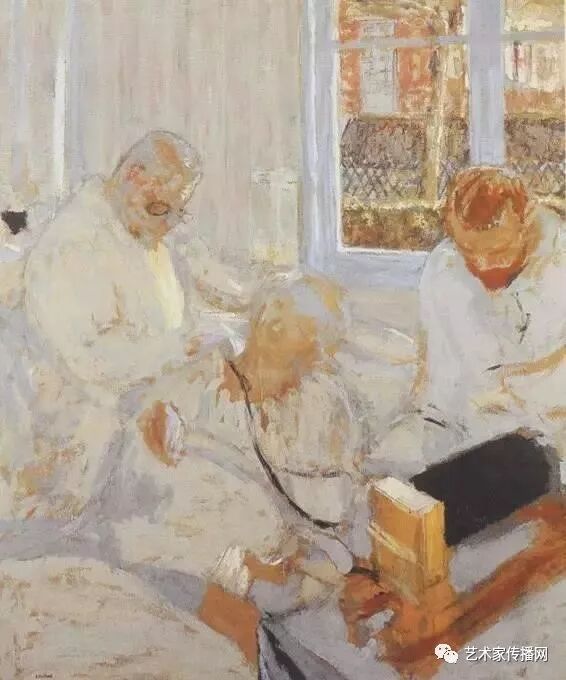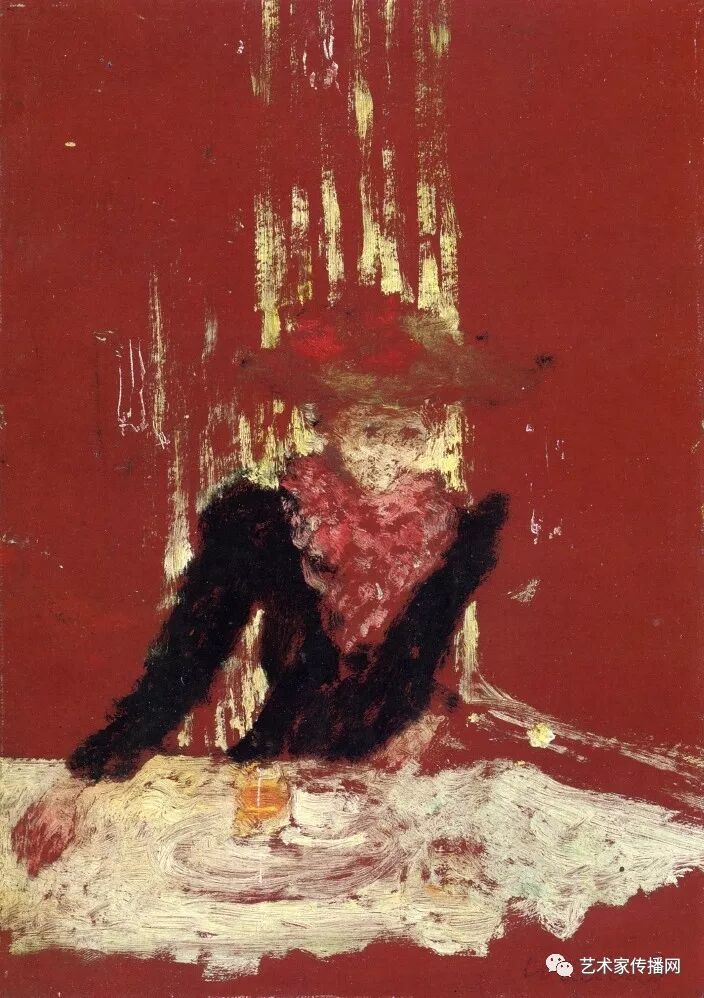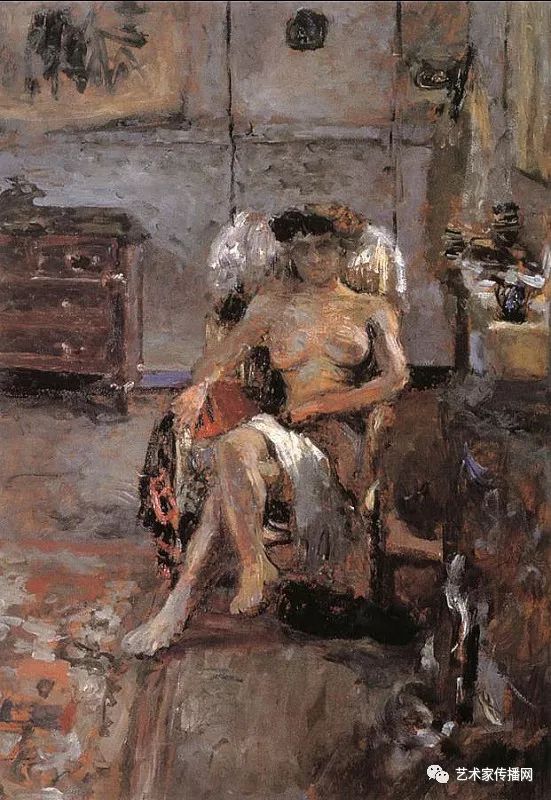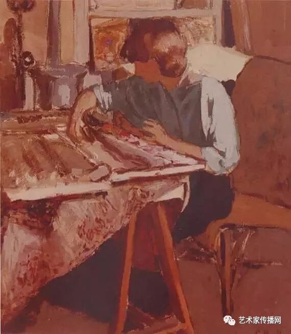 人物刻画及其简略与概括,完全服从整体的效果,有些脸与手仅是一块色块。画面色调沉着清朗,偏于冷灰,画法风格虽与博纳尔相似,但对色调与情趣的处理却有天壤之别。