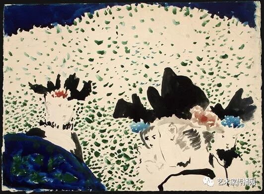 整个画面以平坦的绘画方法作处理,有意减弱空间升读和体积感的表现,讲究色块与色块的和谐配合,并在大的色面中加进密密麻麻、小而有规则的不同色点,形成丰富而生动的色彩效果。