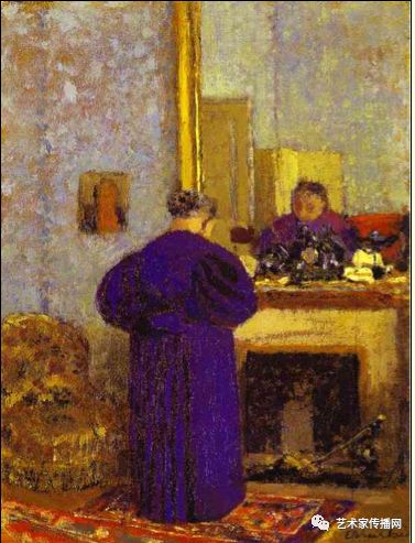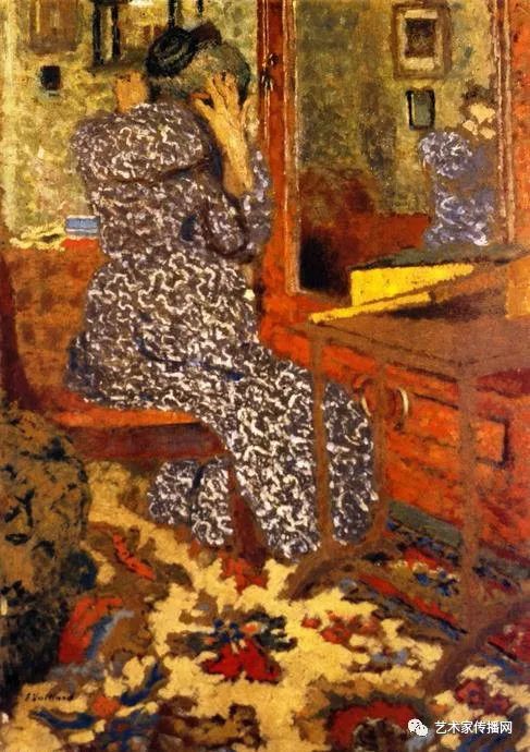 《花裙子》维亚尔将平面的形式与分层的图案结合,三维空间效果变的复杂。背景色调的变化暗示出墙面并不是完全平的,从镜中映出人物的角度也可以判断这一点。