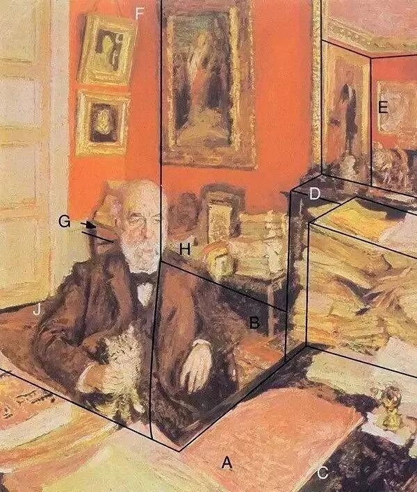 例如在维亚尔创作的《台奥多尔·杜蕾》这张油画作品中,首先,堆满书籍的书桌(A)形成一个高台,你必须越过它才能继续观看。接着是一个井状的空间,画中的人物和那只警觉的猫就坐在里面(B)。然后,在C点是一堵书籍形成的墙壁,但它的顶端是一个故意设置的陷阱,它与壁炉(D)上方的面饰融合在一起。越过壁炉,又是一个令人迷惑的空间问题:突然之间,你发觉自己好像已经透过望远镜,到达房间远处的角落了(E)。