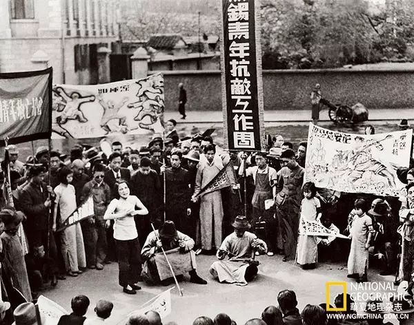 1944年,青年抗敌救亡运动,在街上演唱歌曲激发民众的爱国热情。
