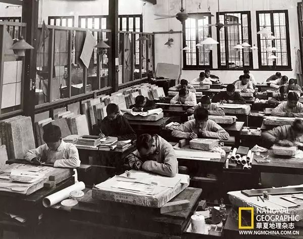 1927年,上海商业印刷厂,工人在刻写用来彩印的石版。